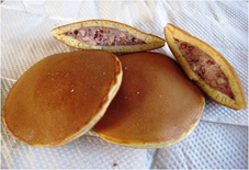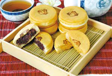 注入橢圓型鐵制或銅制的模具中,然后放入內(nèi)餡(多為小豆餡),